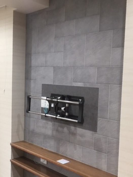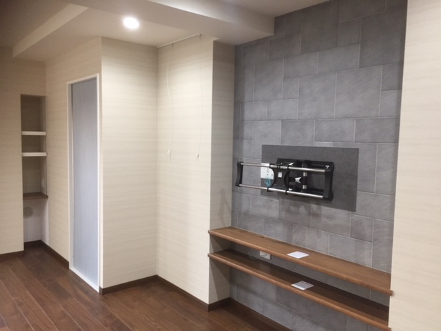 理想を描いていたヴィンテージ風のお部屋になるように床や棚の色合いにこだわり、全体的な雰囲気に合うようにテレビの背面にはストーン調のエコカラットをお勧めしてもらいました。