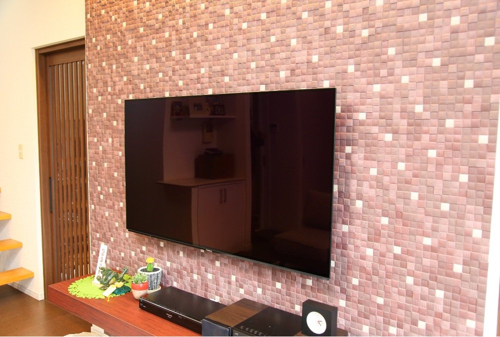 LDKは広々とゆったりと活用したかったので憧れだった壁付けテレビの仕様にしてもらいました。気になっていたケーブルの配線もテレビの背面に隠して配置してくれているのですっきりとまとまった印象でお気に入りです。壁面には、アクセントウォールとしてリクシルのエコカラット・ラグジュアリーモザイクを提案してもらいました。品のある上質な仕上がりにとても満足しています。床材は、リビングとは雰囲気を変えお手入れのしやすさも考えたサンゲツのフロアタイルを提案してもらいました。