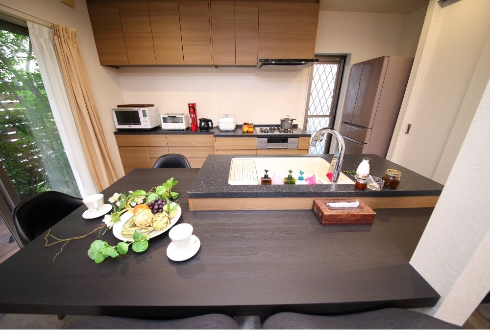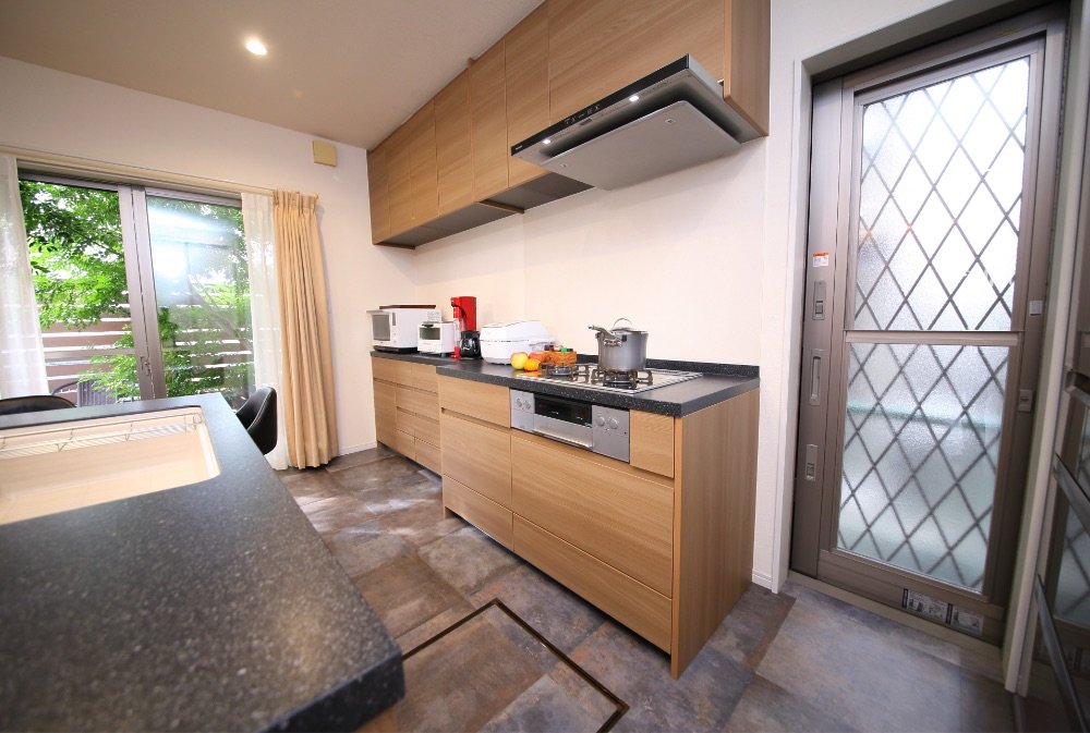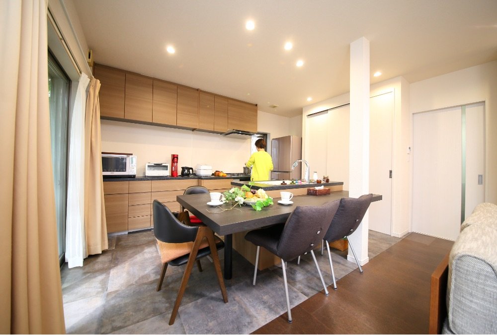 収納スペースが少なく食器の置き場に困っていたキッチン周りには、扉が3枚連動して大きく開閉ができるパントリースペースの新設で食材もストレスなく収納でき、また壁一面のカップボードを提案してくれました。食卓の天板はMidoriさんにオーダーで作ってもらいました。パナソニックLクラスキッチンと統一感のあるデザインでお気に入りです。