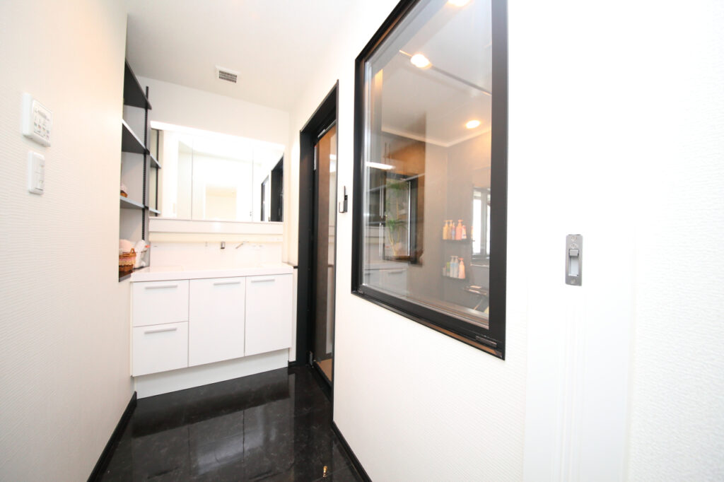 『悩んだところは浴室を2階から3階に持って上がってきたことで、浴室の既存の窓の位置が自由に変更できないところがネックでした。以前こども部屋だったところにお風呂を持ってきましたが、既存の窓の位置は開けにくい位置になりそうでした。開閉しにくいのは不便だし、閉鎖的にはしたくない。最終的にはその窓は壁にして、2面の窓を設置しました。』洗面室と繋がりのある窓があることで、閉鎖感もなくなり、中で家族が倒れてもすぐ気づくことができるとの配慮から室内窓の設置を決められました。