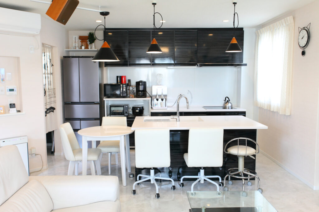 『夫婦2人暮らしで出来るだけ手間のないようにしたいと思い、キッチン横にテーブルを置きしました。配膳や後片付けが断然ラクに。冷蔵庫の横にはパントリーを作り、動線が短くなって使い易くなりました。』『テーブルの下の床下コンセントもポイント。床下がコンクリートで難しかったと思いますが、なんとか頑張って床下コンセントをつけてもらいました。プレートやミキサーなど調理器具を使うのでここがベストポジションで、すごく活躍しています。』