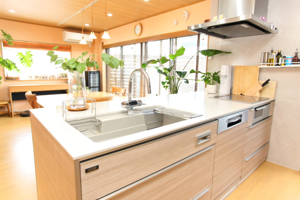 キッチンはタカラスタンダードの最上級グレードのレミュー。キッチンの長さやお部屋の広さを考慮してペニンシュラキッチンをご選定されました。大容量の海外製食洗機BOSCHや、コンセントもシンク下に内蔵されており、ミキサーやブレンダーなどの使い勝手が◎。大容量の収納力があるのもポイント。引き出しも多くて、たっぷりキッチン用品が入り、リビング側からのお皿の出し入れがとても便利とのこと。