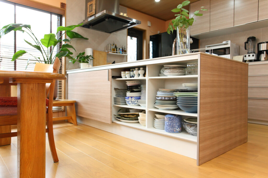『リフォーム後は主人が料理を手伝ってくれるようになりました!あと、お友達を家へ招いたとき、キッチンのカウンター側の扉をスライドしてお皿を出すと、収納になっていることに驚かれます。元々、食器を入れていた棚を処分して、この収納スペースに収まったのでとても満足しています。』
