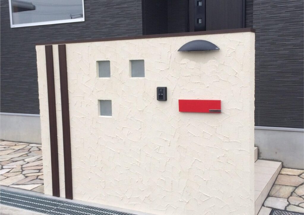 門柱には、二本のライン強調させ、ガラスブロックを入れました。アクセントカラーとしてポストに赤を取り入れ、スタイリッシュの中にもかわいさを演出しています。