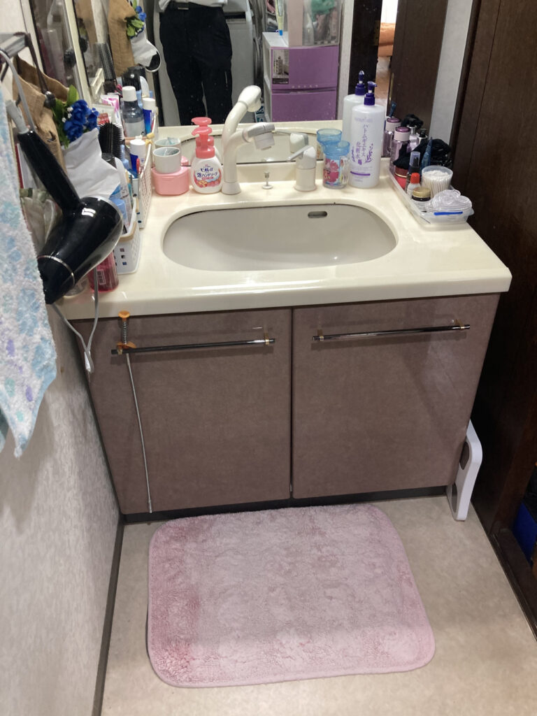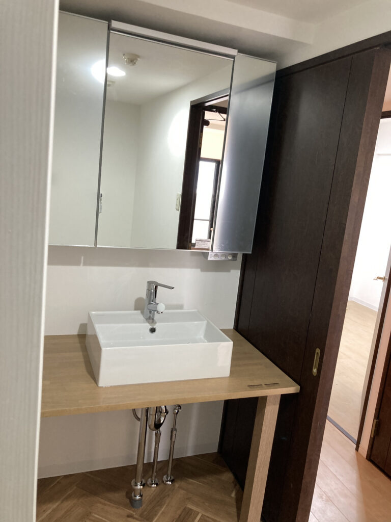洗面化粧台は造作で作成させて頂きました。 床材にはヘリンボーン柄のクッションフロアをご提案しました。