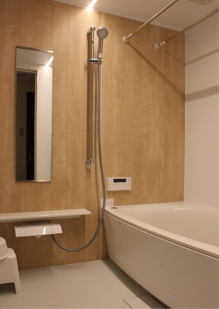 浴室には、パナソニックのMRを採用。気分に合わせて調色を変えられるフラットライトで寛ぎの空間を演出できます。 下記の洋室は、和室を改装して垂れ壁を撤去し立川ブラインドのプレイス スウィングを設置しました。