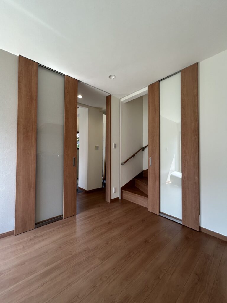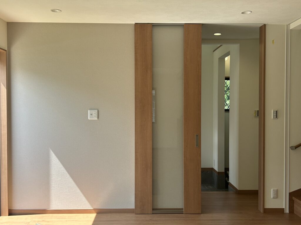 建具には木目とガラスを組み合わせた引き戸を採用。空間をゆるやかにつなぎながら、必要に応じてゾーニングもできるため、開放感とプライバシーのバランスを両立しています。