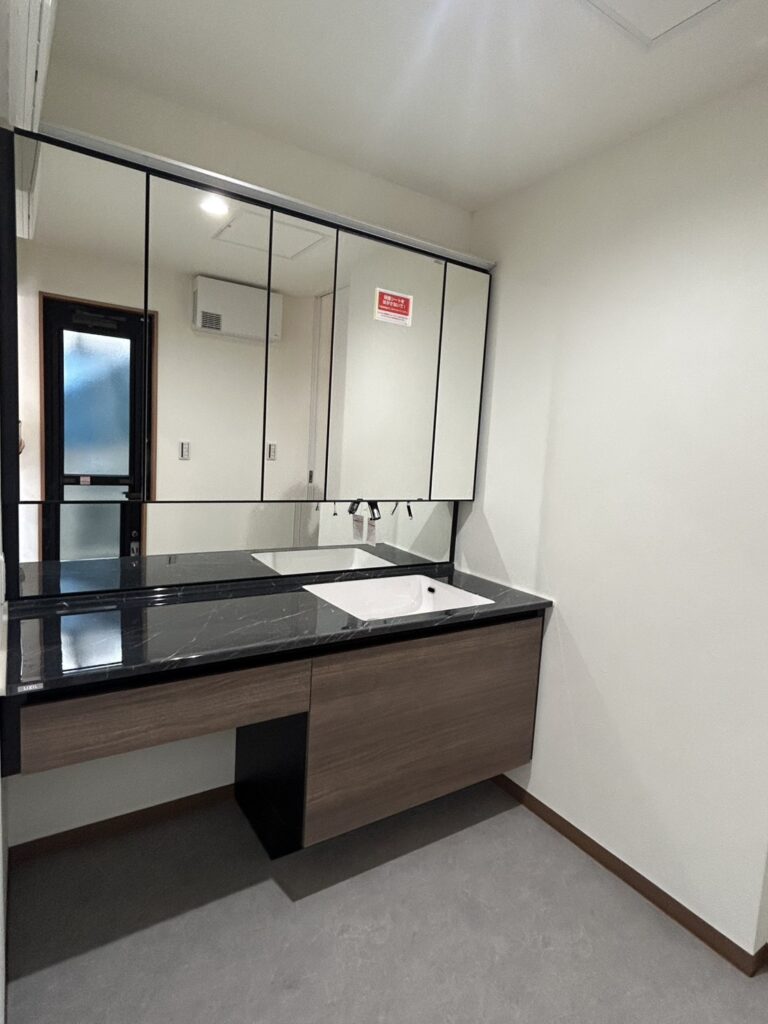 床はLDK全体で素材と色味を統一し、視線の抜けと広がりを演出。生活動線がスムーズで使いやすい間取りに改善しました。