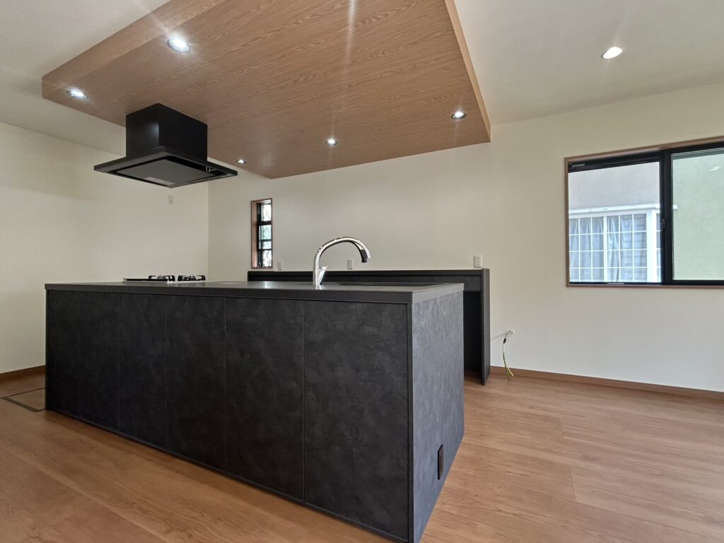 キッチンをアイランド型にすることで、複数人での調理や配膳もしやすく、ご家族とのコミュニケーションが自然と生まれるキッチンに。